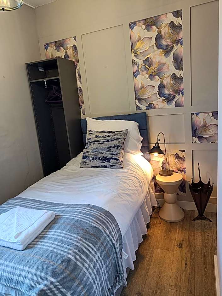 This room is located on the 3rd floor, accessible by 66 steps. It has double bed, with an private bathroom, complimentary toiletries, hairdryer, tea/coffee making facilities, WiFi, a flat-screen TV, and overlooks Cheltenham town center. A kitchenette provides tea/coffee making facilities with microwave, toaster, and mini fridge., An Iron & Ironing board are also available.